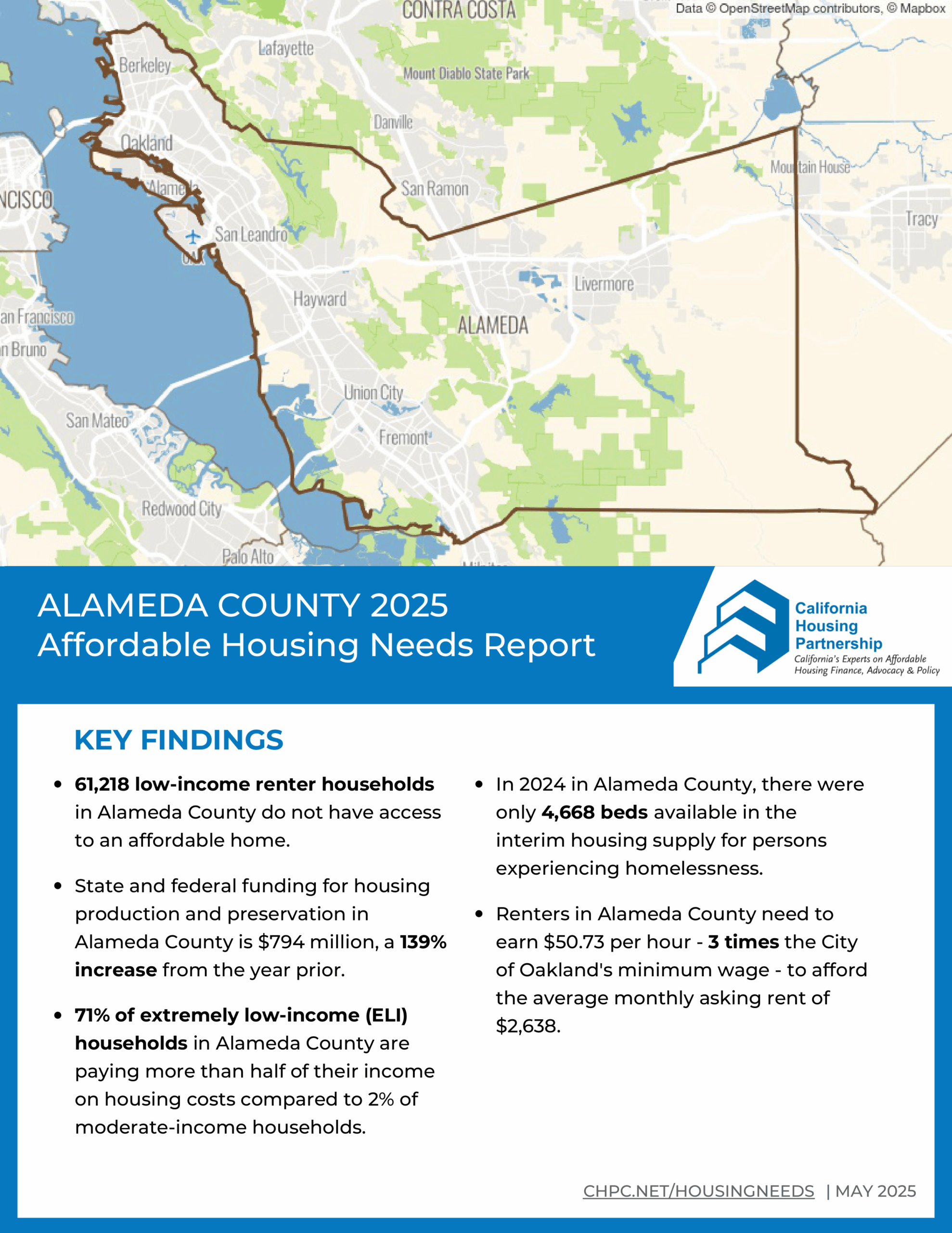 The 2025 Affordable Housing Need Report highlights market conditions in Alameda County and key indicators of housing need for low-income families, including: levels of housing production, state and federal funding, asking rent trends, and local wages.