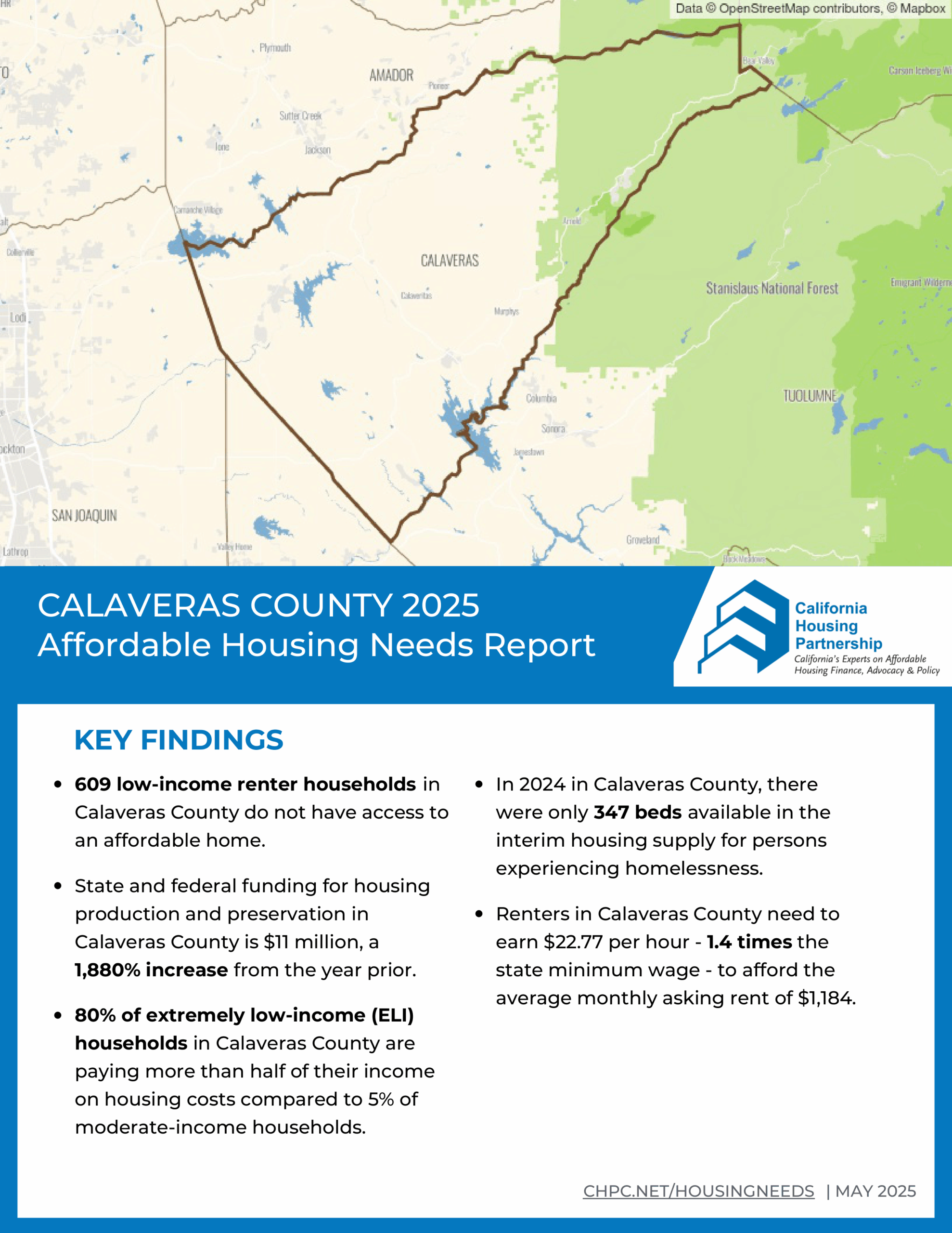The 2025 Affordable Housing Needs Report highlights market conditions in Calaveras County and key indicators of housing need for low-income families, including: levels of housing production, state and federal funding, asking rent trends, and local wages.