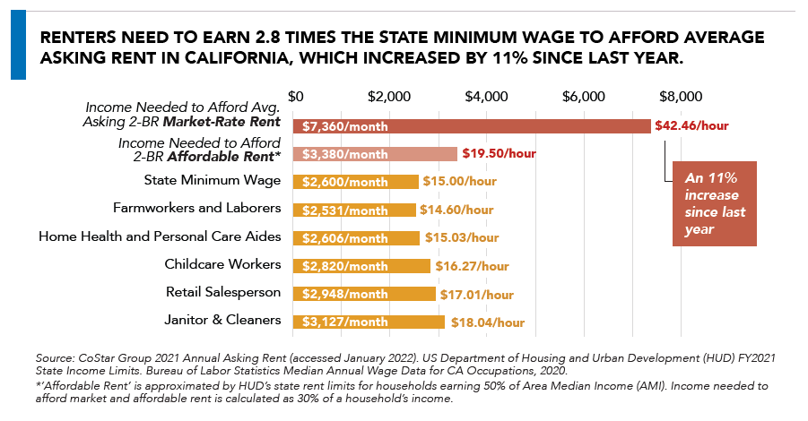 - Renters need to earn 2.8 times the state minimum wage to afford average asking rent in California, which increased by 11% since last year.