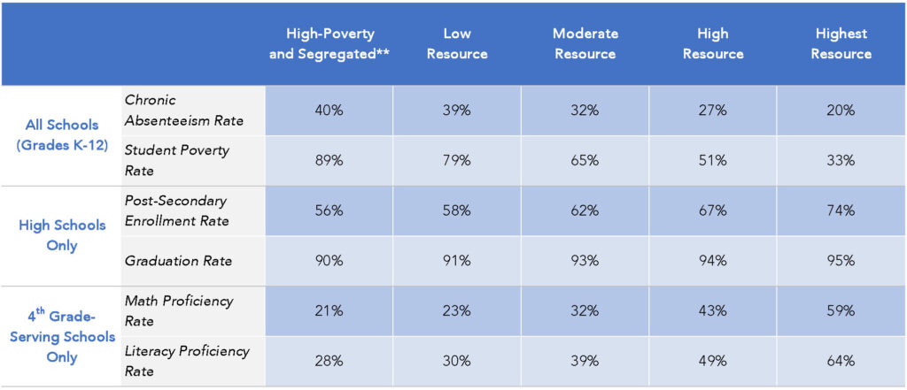 As shown in Table 1, schools near High and Highest Resource tracts and rural block groups have much higher rates of post-secondary enrollment, high school graduation, and testing proficiency and much lower rates of student poverty and chronic absenteeism than schools in Low Resource and High-Poverty & Segregated areas. For example, the median student poverty rate of schools in Highest Resource areas is 56 percentage points lower than in High-Poverty & Segregated areas (33% vs. 89%), and the difference in testing proficiency rates is approximately 37 percentage points for both testing subjects.