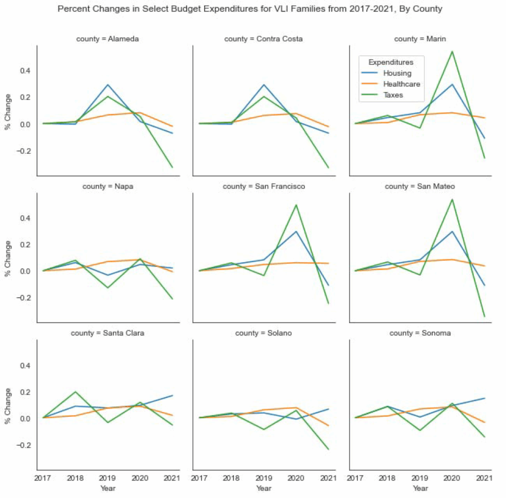 Figure 1 shows how Marin, San Francisco, and San Mateo counties saw sharp percent increases in certain expenditures, with housing costs rising by 20% from 2019 to 2020. While healthcare costs have remained relatively stable across the past 5 years, housing cost of fluctuated greatly over time and across counties. There were also 40% increases in taxes and 20% increases in miscellaneous costs from 2019 to 2020, such as one-time expenses for shopping and office equipment.