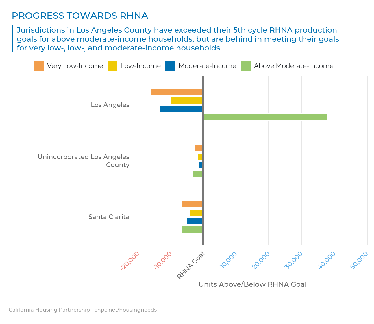 Jurisdictions in Los Angeles County exceeded their 5th cycle RHNA production goals for above moderate-income households, but are behind in meeting their goals for very low-, low-, and moderate-income households.