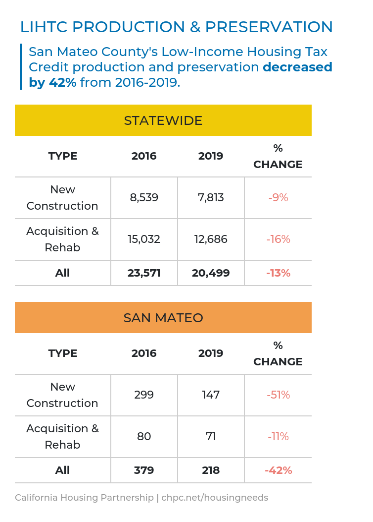 San Mateo County’s Low-Income Housing Tax Credit production and preservation decreased by 42% from 2016-2019.