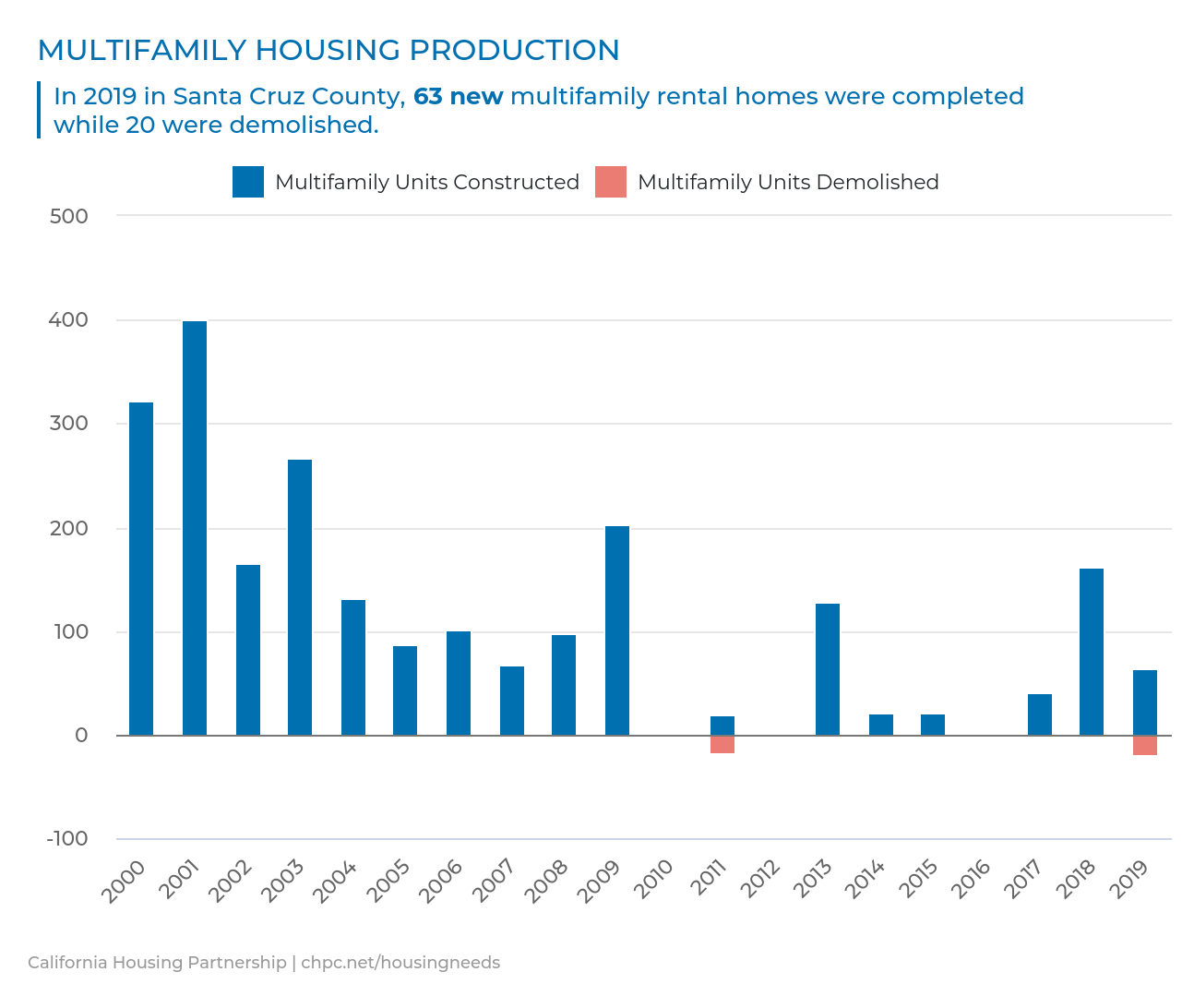 In 2019, developers in Santa Cruz County completed 63 new multifamily rental homes while demolishing 20 for a net gain of 43.