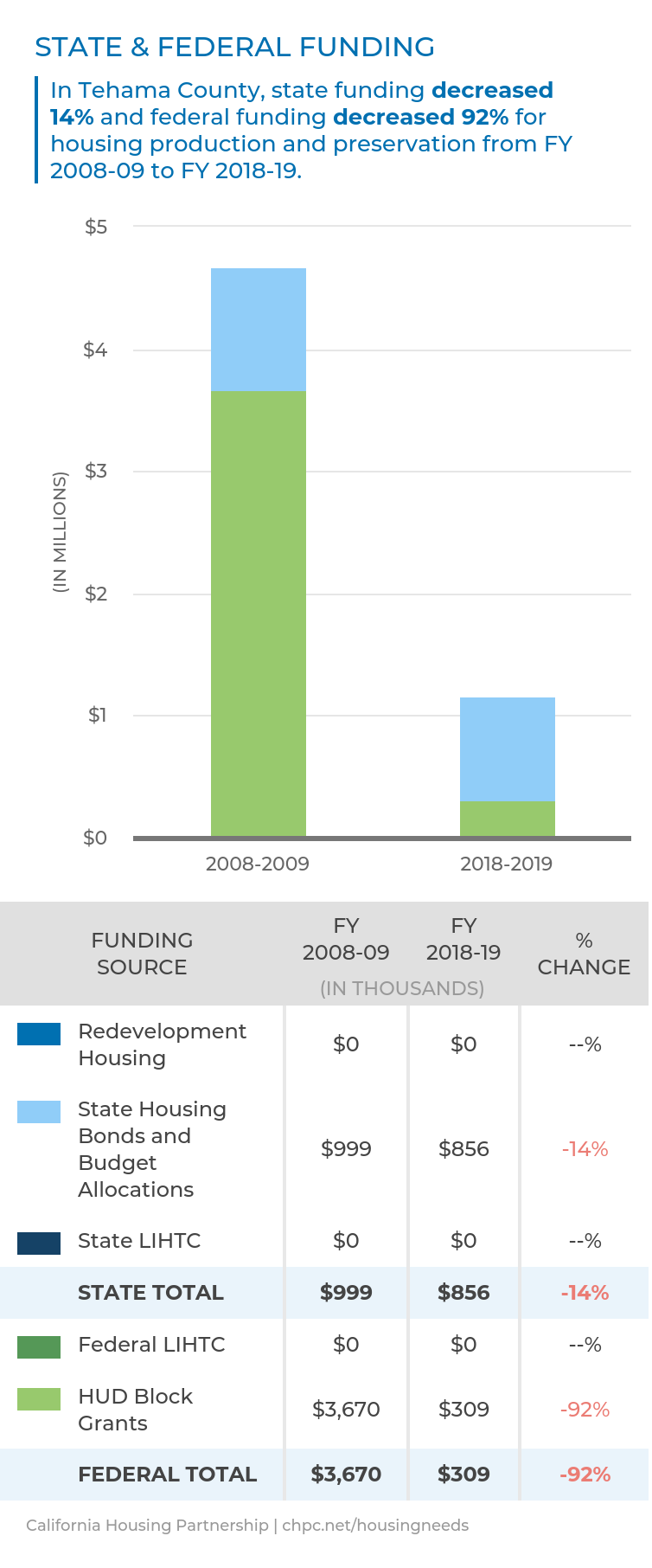 In Tehama County, state funding decreased 14% and federal funding decreased 92% for housing production and preservation from FY 2008-09 to FY 2018-19.