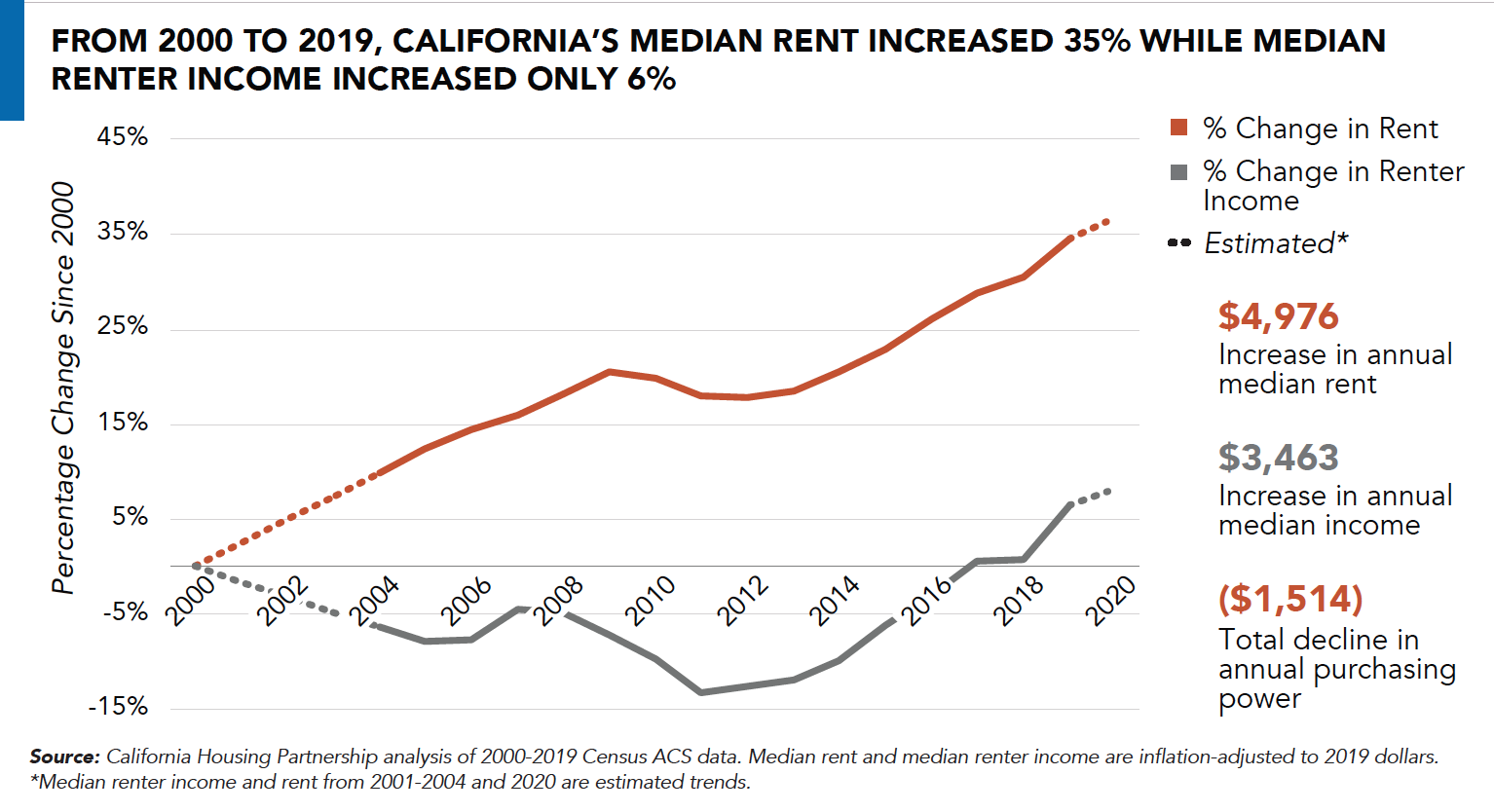• Median rent in California has increased 35% since 2000 while median renter household income has only increased by 6% (adjusted for inflation).