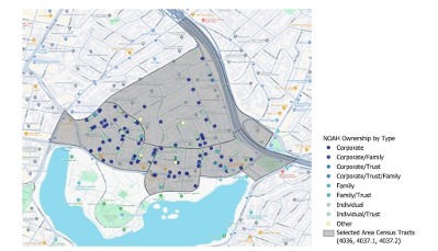 With our collected property data, our team classified properties by ownership type based on the content of their linked owner names: corporate, family, individual, or trust ownership.9 Out of 168 unsubsidized affordable properties, we determined that 93 were owned by corporations, 20 by family, 27 by trusts, and 64 by individuals. These categories are not mutually exclusive – a property can be owned by a corporation and a family, for example, although not a corporation and an individual. The map in Figure 1 summarizes the spatial distribution of ownership types throughout the case study area, with a majority of properties having at least one link to corporate ownership (about 55%). Notably, a significant portion of properties were owned by individuals (about 38%).